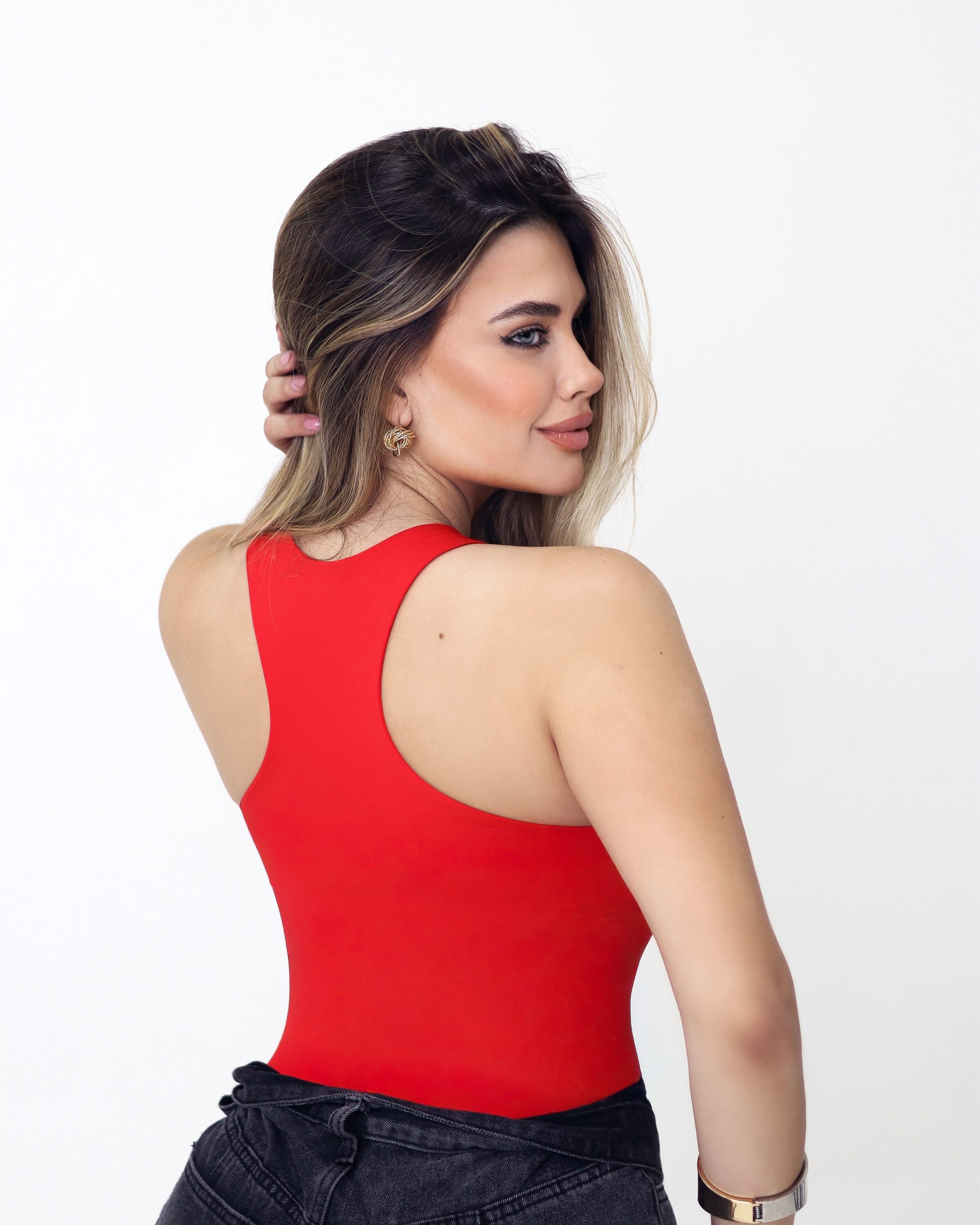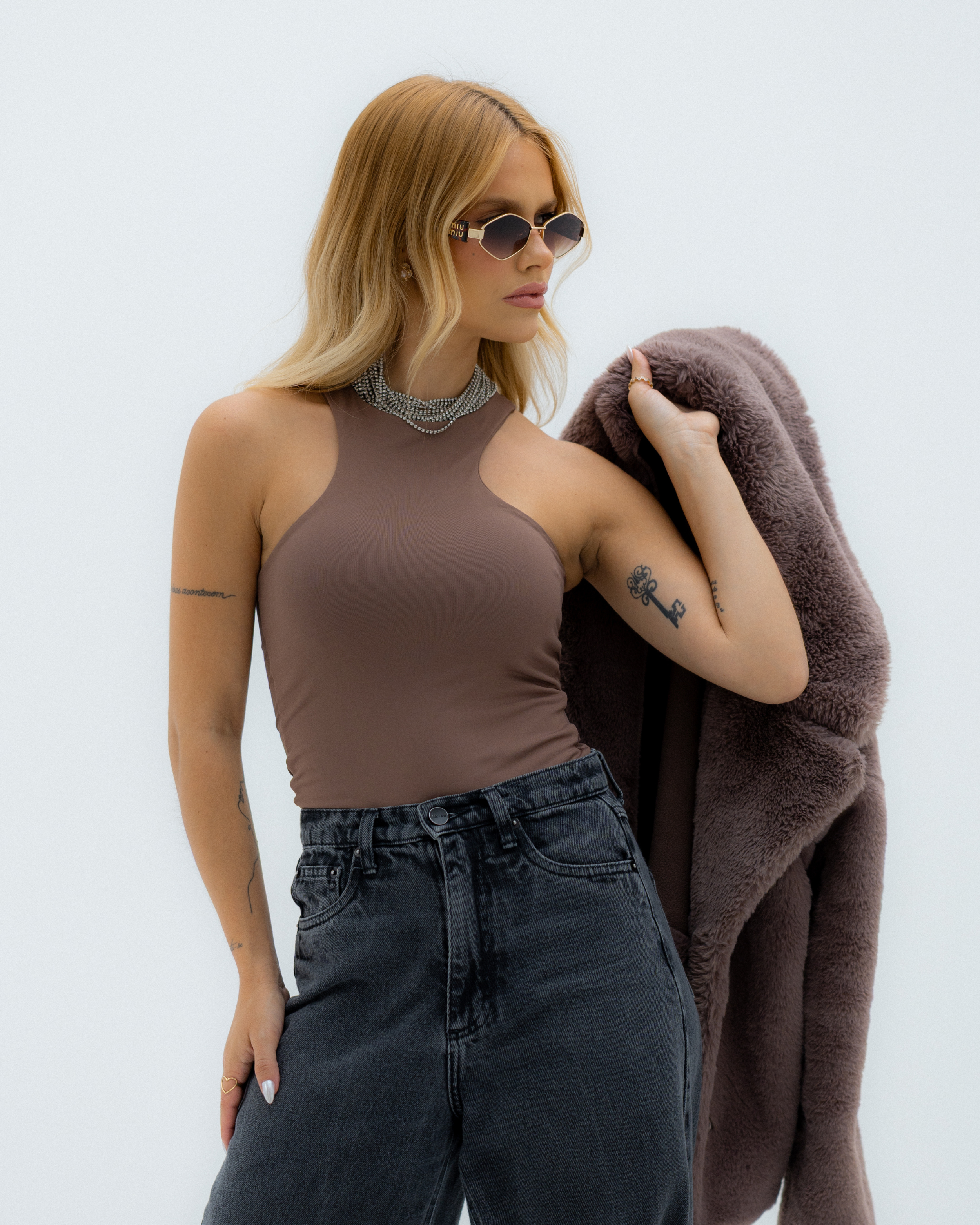 O Body Renata é a tradução da modernidade e do estilo urban chic. Com um design de decote halter que valoriza os ombros de forma estruturada e feminina, ele é a peça perfeita para quem busca um visual autêntico e extremamente sofisticado, ideal para compor produções que exigem um caimento impecável.